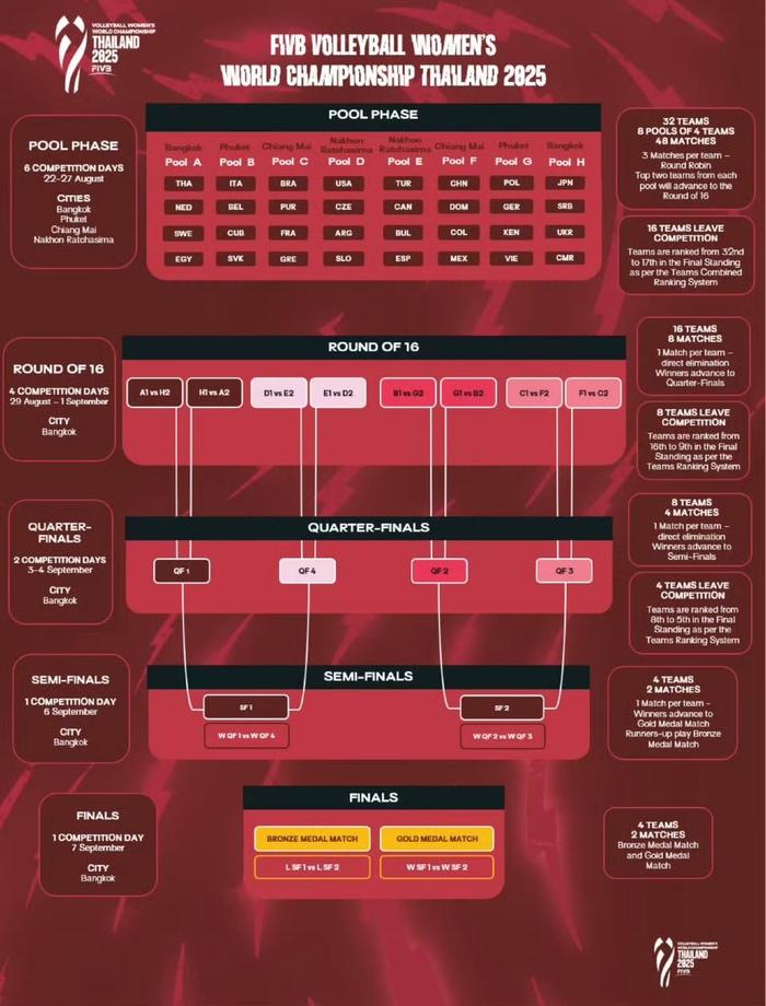 进入2028年洛杉矶奥运会周期,国际排联对世锦赛展开大刀阔斧的改革:从以往四年一届改为两年举办一次,参赛队伍从24支扩军至32支,赛制也调整为小组赛+单败淘汰赛。这一系列“组合拳”,意在提升比赛的紧凑性和悬念感,为更多队伍提供参与顶级对决的机会。